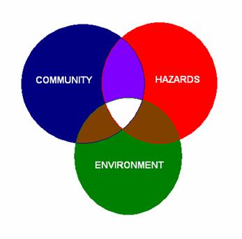 The relationship between hazards, the community and the environment as discussed in EMG101, is demonstrated by the following figure: