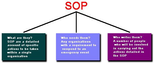 SOP are used in various ways by military, police and emergency service organisations to detail specific preplanned responses to identified emergency events. In our case, we are using SOP to detail our tactics to respond to the onset of the threat we identified in our hazard analysis and for which we produced an emergency plan.